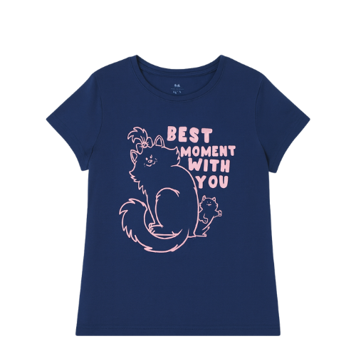 KIABI Blue Cat T-Shirt features an adorable cat print on soft cotton fabric, perfect for casual summer wear. Sizes 3-12 years.