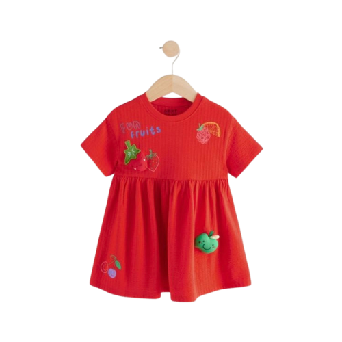 Adorable red strawberry-printed dress by NEXT, made from soft cotton for everyday comfort. Perfect for little girls’ casual days or special outings.