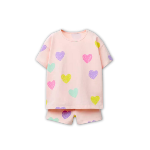 ZARA Peach Heart Set includes a soft cotton top with a heart print and matching bottoms, perfect for casual outings and summer wear. Sizes 2-6 years.